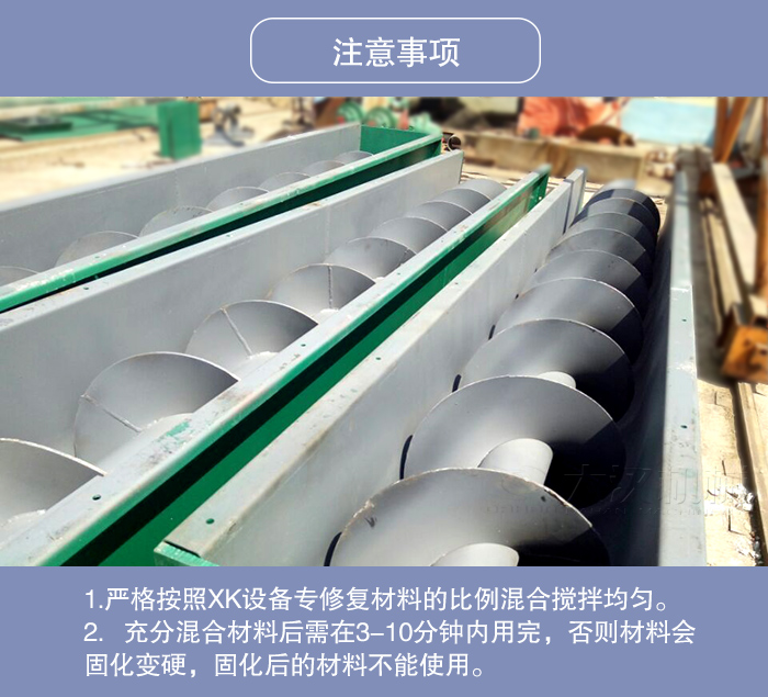 1.嚴(yán)格按照XK設(shè)備專(zhuān)修復(fù)材料的比例混合攪拌均勻。攪拌不均勻會(huì)出現(xiàn)局部不耐磨情況。