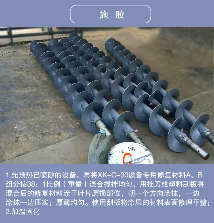 1.先預(yù)熱已噴砂的設(shè)備,再將XK-C-30設(shè)備專(zhuān)用修復(fù)材料A、B組分按38:1比例(重量)混合攪拌均勻,用批刀或塑料刮板將混合后的修復(fù)材料涂于葉片磨損部位,朝一個(gè)方向涂抹,一邊涂抹一邊壓實(shí);厚薄均勻。使用刮板將涂層的材料表面修理平整;