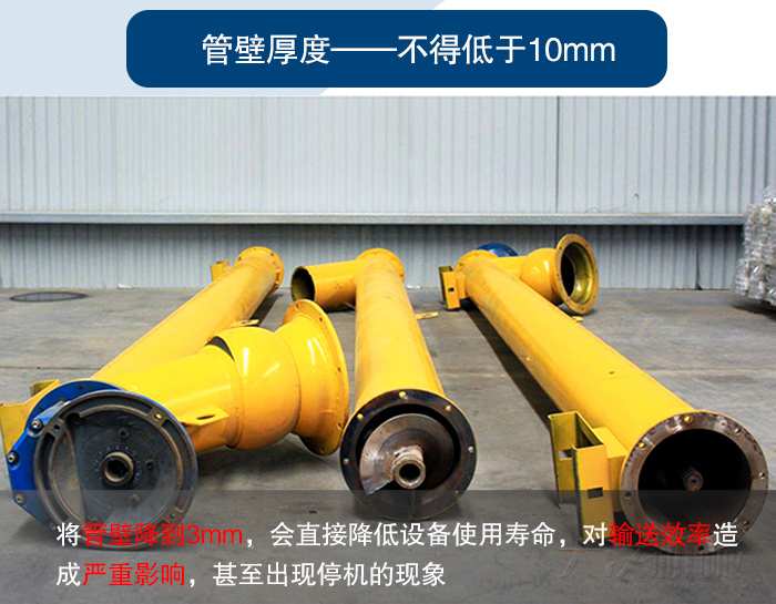 一般情況下,管式螺旋輸送機管壁厚度要求不低于10mm,有些廠家為了在其中賺取更多利益,將管壁降到了3mm,會直接降低設備使用壽命,對輸送效率造成嚴重影響,甚至出現(xiàn)停機的現(xiàn)象。