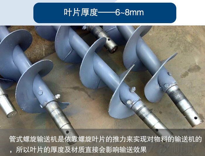 管式螺旋輸送機是依靠螺旋葉片的推力來實現(xiàn)對物料的輸送機的,所以葉片的厚度及材質(zhì)直接會影響輸送效果,葉片厚度一般在6~8mm左右,也可以根據(jù)物料的耐磨程度來加厚,這些直接與設備的使用壽命掛鉤的,所以用戶在選型時要特別注意這一點。