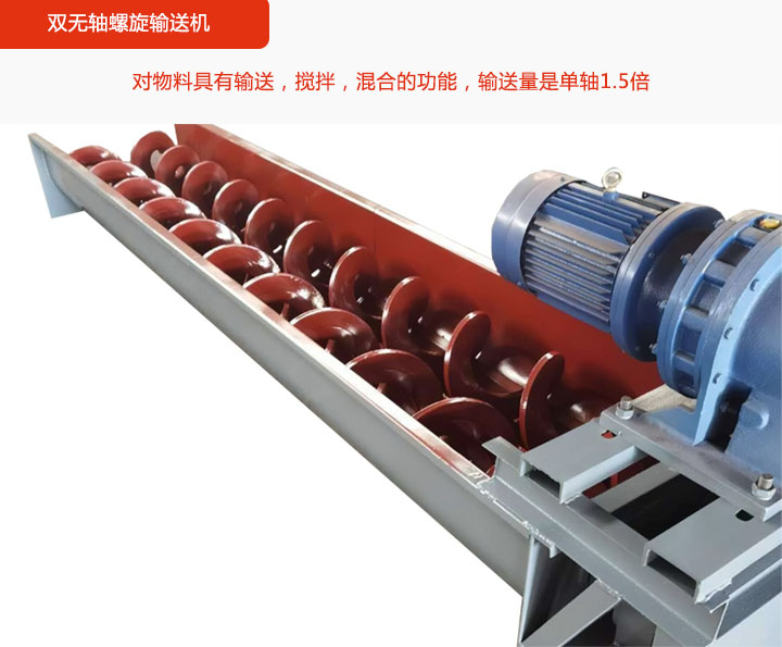 雙無軸螺旋輸送機:采用兩根螺旋軸組成,且軸旋轉(zhuǎn)方向相反,輸送物料同時還可對物料攪拌,混合,其輸送量是單軸1.5倍