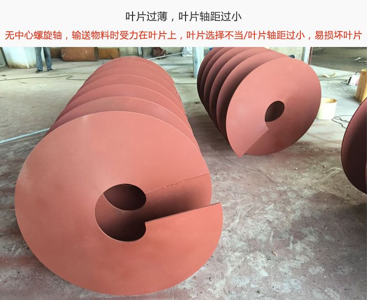 葉片軸距過小:螺旋槽體選擇不當,輸送物料的時葉片軸距過小,會造成擠壓力過大,損傷葉片;若槽體較小,同樣也會造成壓力過大,導致葉片損害。