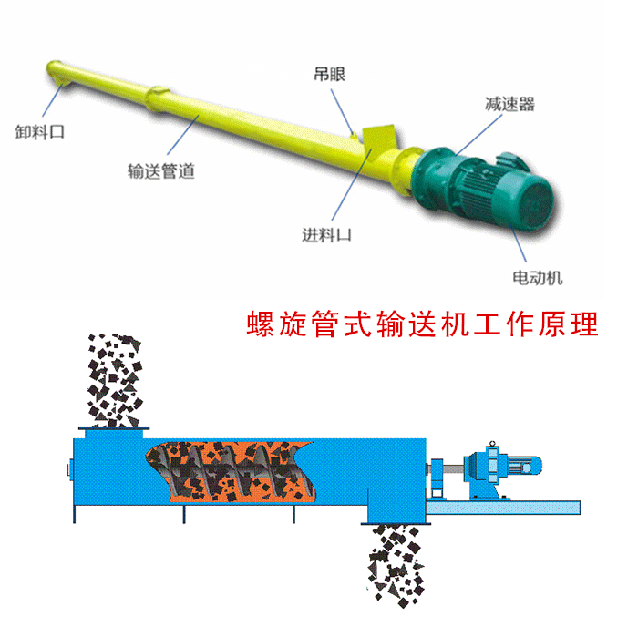 螺旋管式輸送機是依靠電機帶動螺旋回轉,對物料進行推移從而實現,輸送的目的的一種連續輸送設備,可以水平,傾斜,垂直輸送粉末,顆粒及小塊狀物料。有結構電簡單,橫截面小,密封性好,操作方便,維修員容量的。