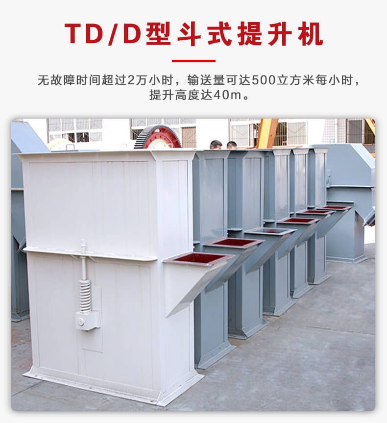 TD型斗式提升機(jī)由運(yùn)行部分料斗與牽引膠帶、帶有傳動(dòng)滾筒的 上部區(qū)段,帶有拉緊滾筒的下部區(qū)段,中間機(jī)殼,驅(qū)動(dòng)裝置,逆止制動(dòng)裝置等組成。無故障時(shí)間超過2萬小時(shí),輸送量可達(dá)500m3/h,提升高度達(dá)40m。